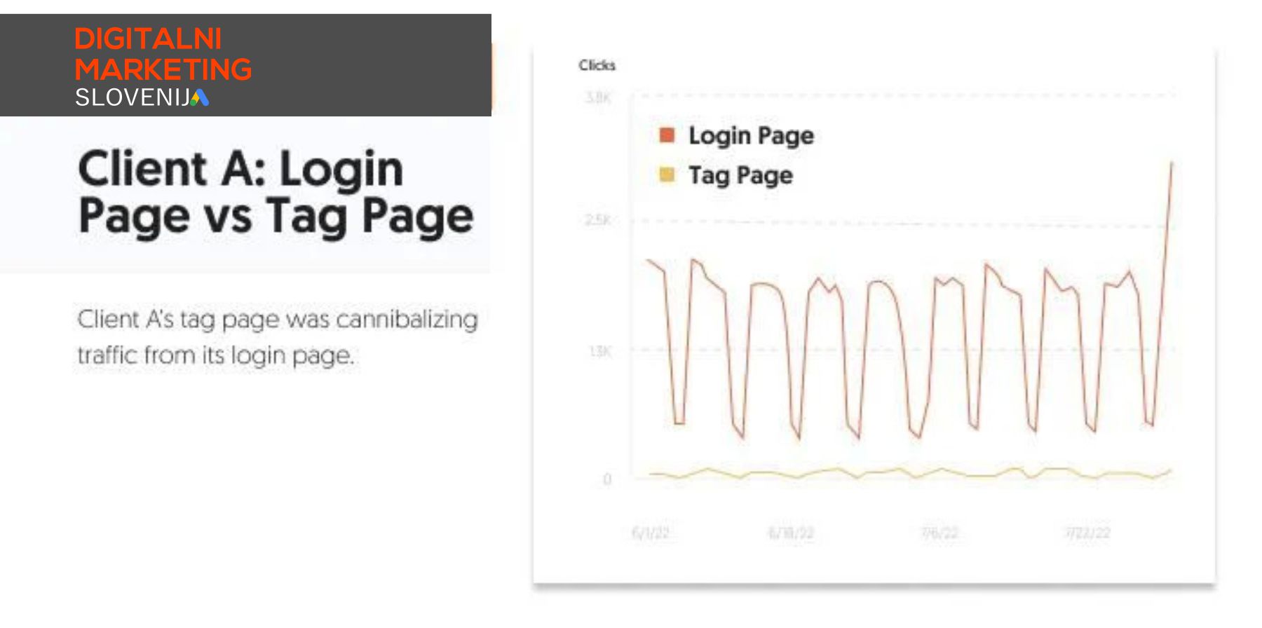 Pri tem očitnem primeru kanibalizacije je ekipa pri UI Digital priporočila URL-je brez indeksiranja, ki stranki niso služili. To vključuje stran z oznako, ki je bila zamenjana za stran za prijavo. Po tej spremembi je Google Search Console nakazal, da je prišlo do takojšnjega padca klikov na stran z oznako in povečanja klikov na dejansko stran za prijavo:
