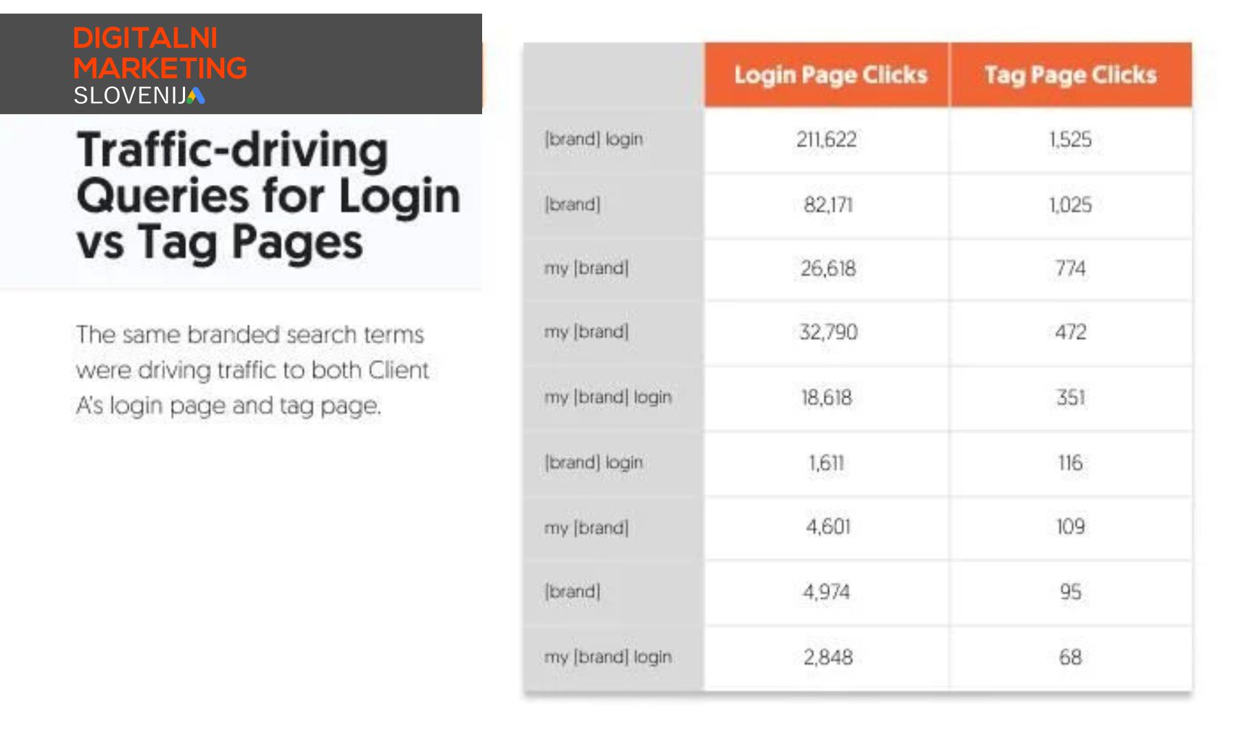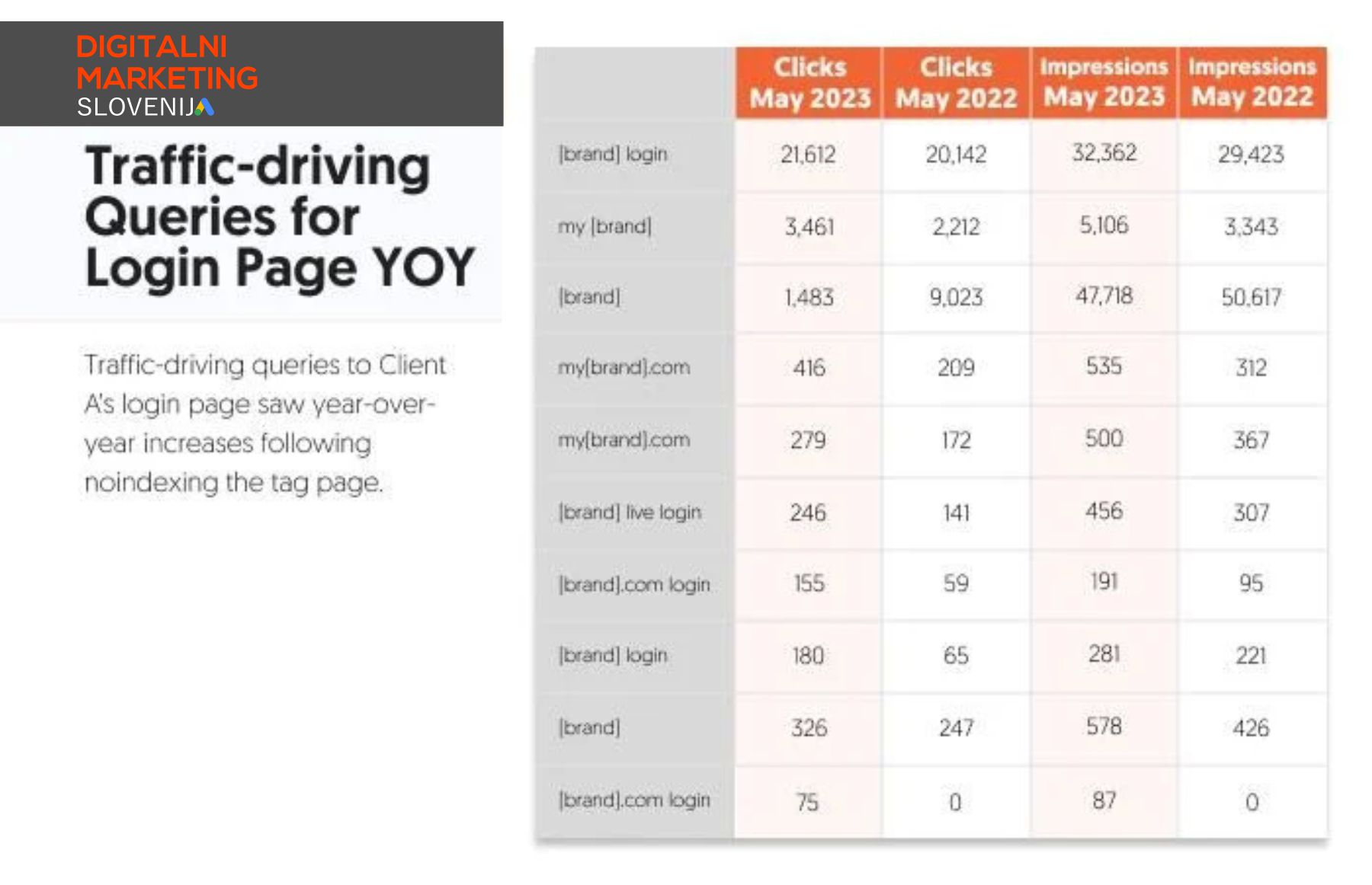 Pomembno je omeniti, da je »prijava [blagovne znamke]« skupaj z izpeljavami povečala število klikov in prikazov iz leta v leto, tako kot celotna stran.