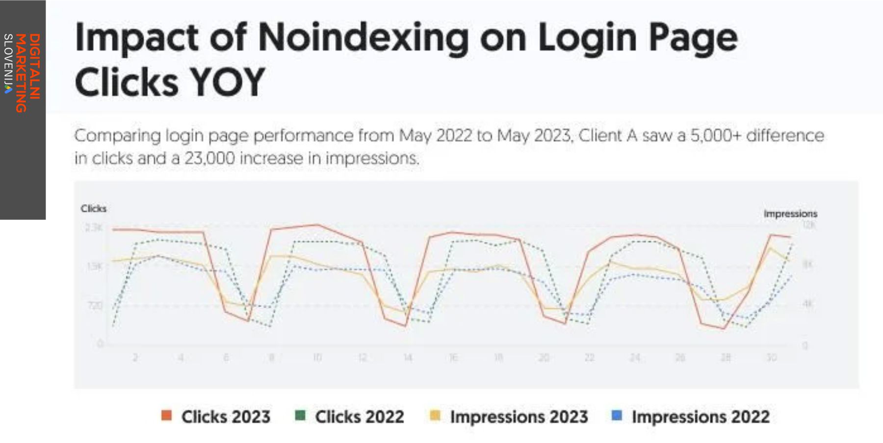 Najprej je stran za prijavo. Z uporabo Google Search Console sem analiziral klike in prikaze v dveh časovnih obdobjih. Primarni časovni razpon je bil od 1. maja 2023 do 31. maja 2023 (polne črte) z medletno primerjavo s 1. majem 2022 do 31. maja 2022 (pikčaste črte). To zagotavlja, da vidimo podatke po neindeksiranju (2023) in pred neindeksiranjem (2022).